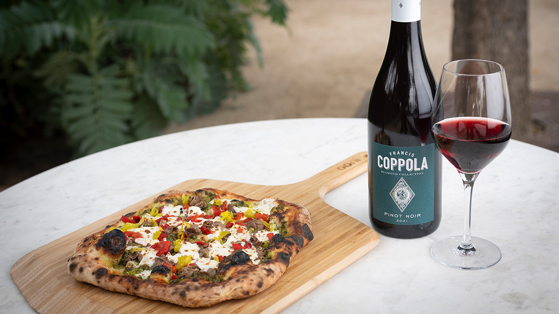 Place one ball of dough on a well-floured surface (refrigerate or freeze the remaining ball of dough). Using hands and fingers, stretch and shape the dough ball into a 10-inch circle. Transfer shaped dough to a pizza peel dusted with semolina flour. Spread 1/4 to 1/3 cup of the pesto over the dough to 1/2 inch of edges. Top evenly with the prepared shaved beef, roasted red bell pepper, pepperoncini, and the mozzarella cheese. Quickly slide pizza onto the pre-heated stone. Bake for 8-12 minutes or until the crust is golden brown and the cheese is bubbly. Serve immediately and enjoy with a glass of Diamond Collection Pinot Noir.