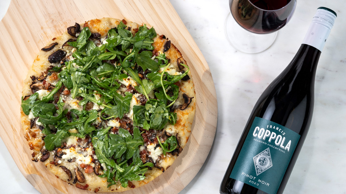 8. Transfer pizza from pan to cutting board and slice into desired number of slices, then top with dressed arugula and enjoy!