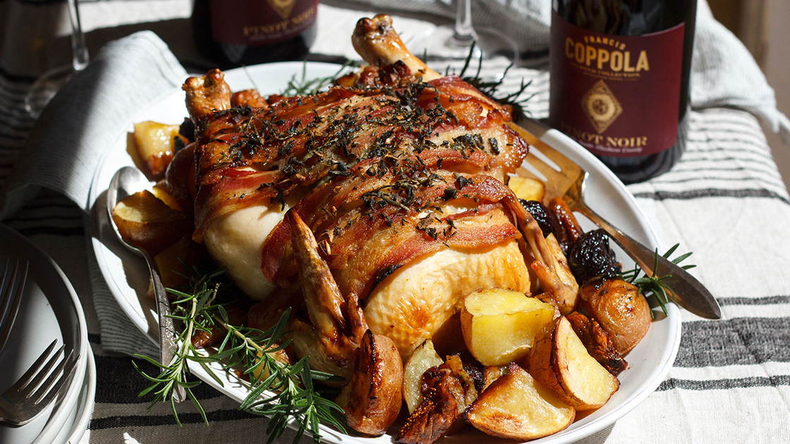 - Allow the chicken to rest for 15 minutes before placing it onto a serving platter. Transfer the potatoes and figs around the bird with a few sprigs of fresh rosemary or sage to garnish.
